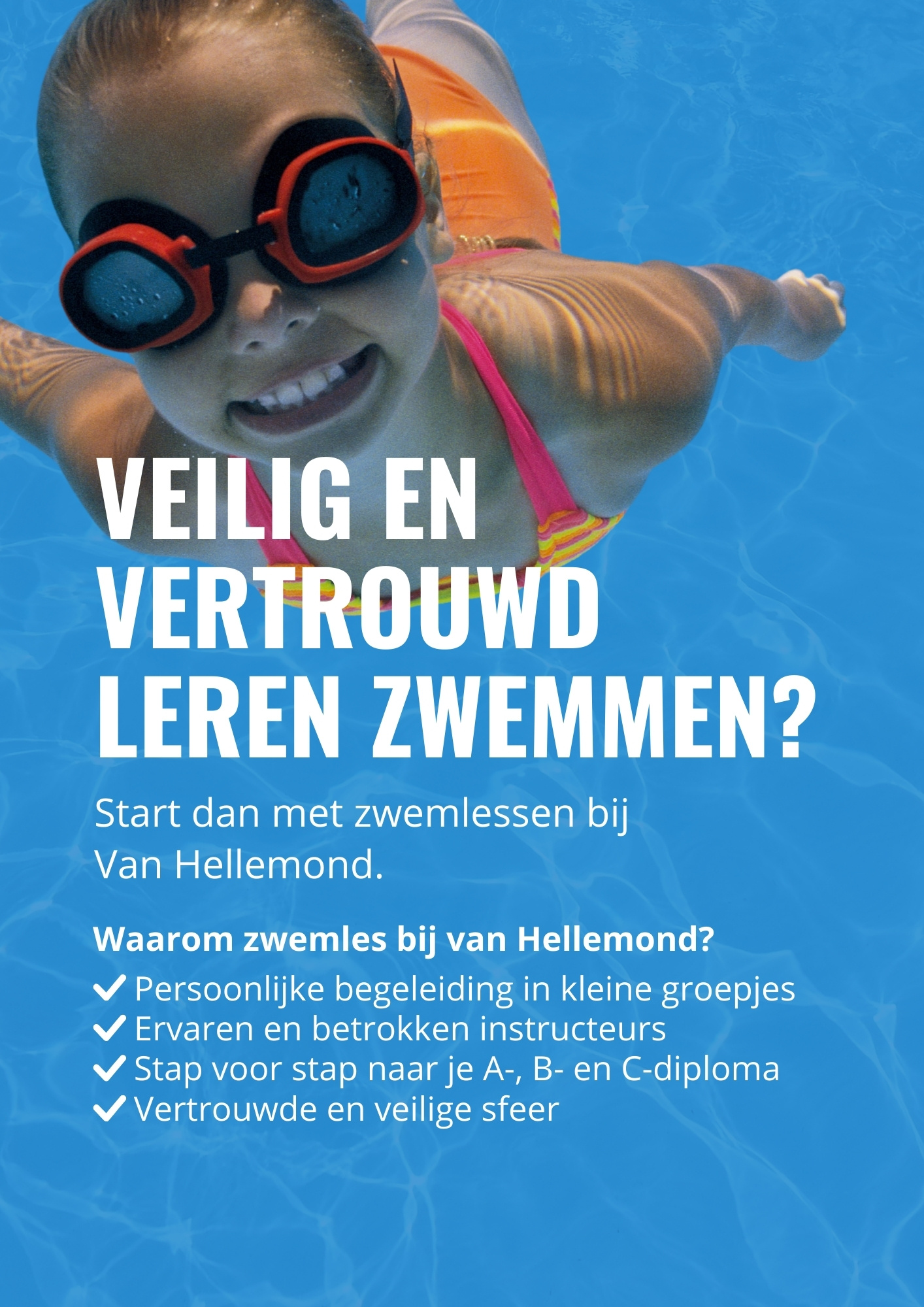 Professionele en persoonlijke begeleiding, veiligheid en plezier. Start vandaag nog met zwemles bij van Hellemond. Zwemles voor alle leeftijden en alle niveaus. Speciaal gericht op het opbouwen van vertrouwen en vaardigheid in het water.